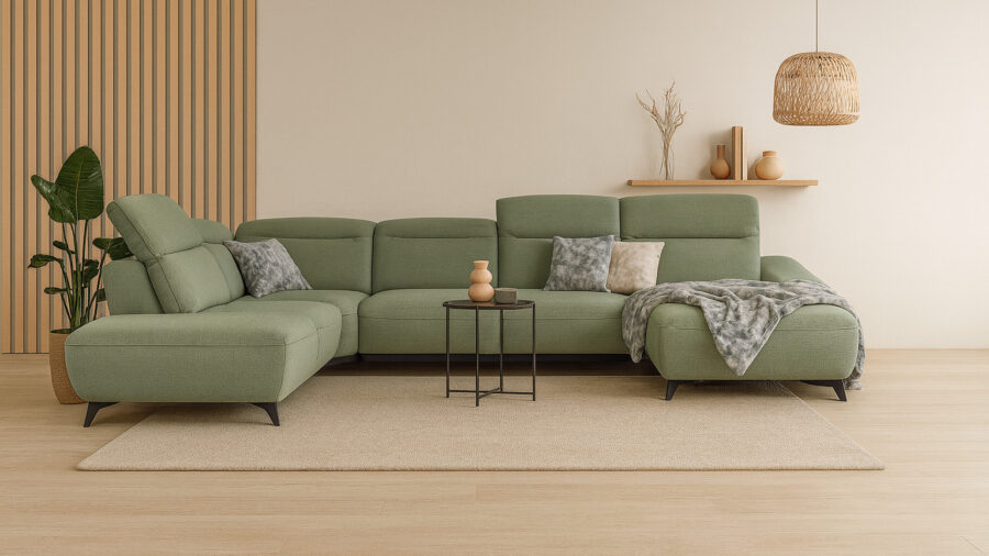 Canapé Panoramique composable avec relax électrique, coffre, têtières réglables et tissu imperméable