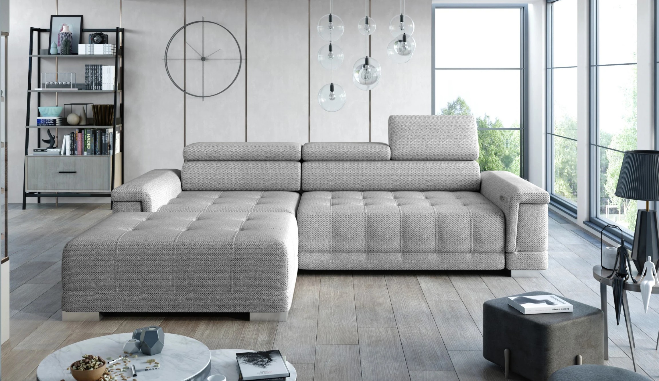 Canapé d’angle avec assises électriques télescopiques , têtières réglables, tissus imperméable