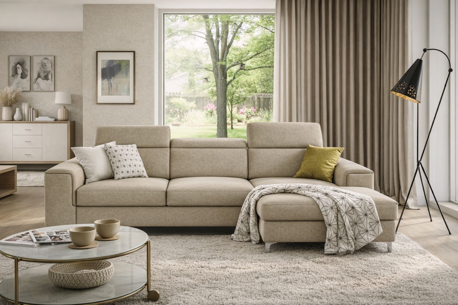 Offrez vous un salon confortable et accueillant avec ce joli canapé d'angle convertible, coffre, avec têtière, Ce canapé d'angle en tissu vous permettra de créer un espace détente. Il vous propose un excellent confort d’assise et ses têtières réglable qui s’accorderont à vos mouvements.