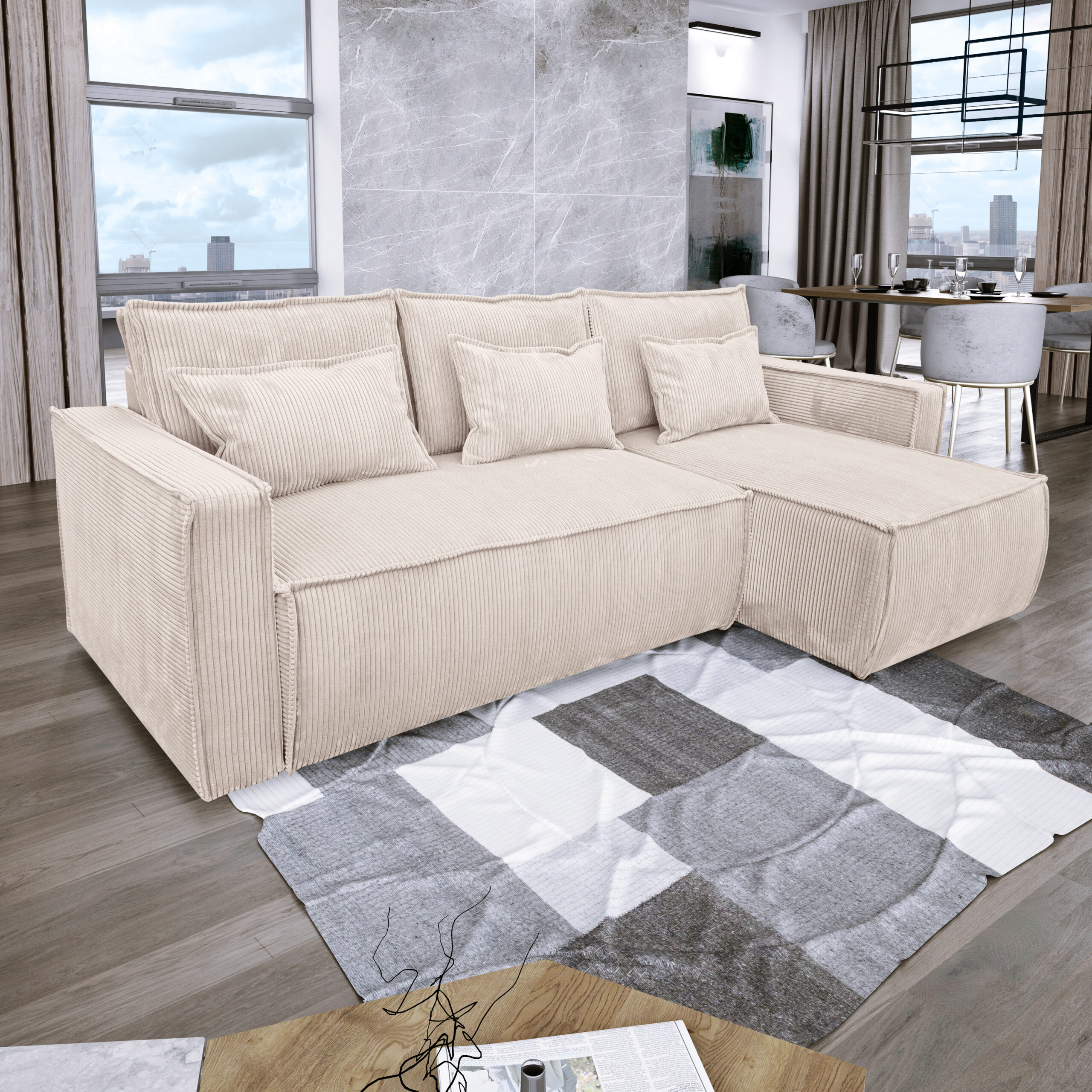 Mousse polyuréthane 21 kg/m3 + 3 grands coussins déhoussables + 3 coussins lombaires + 2 petits coussins garnis de flocons de mousse polyuréthane