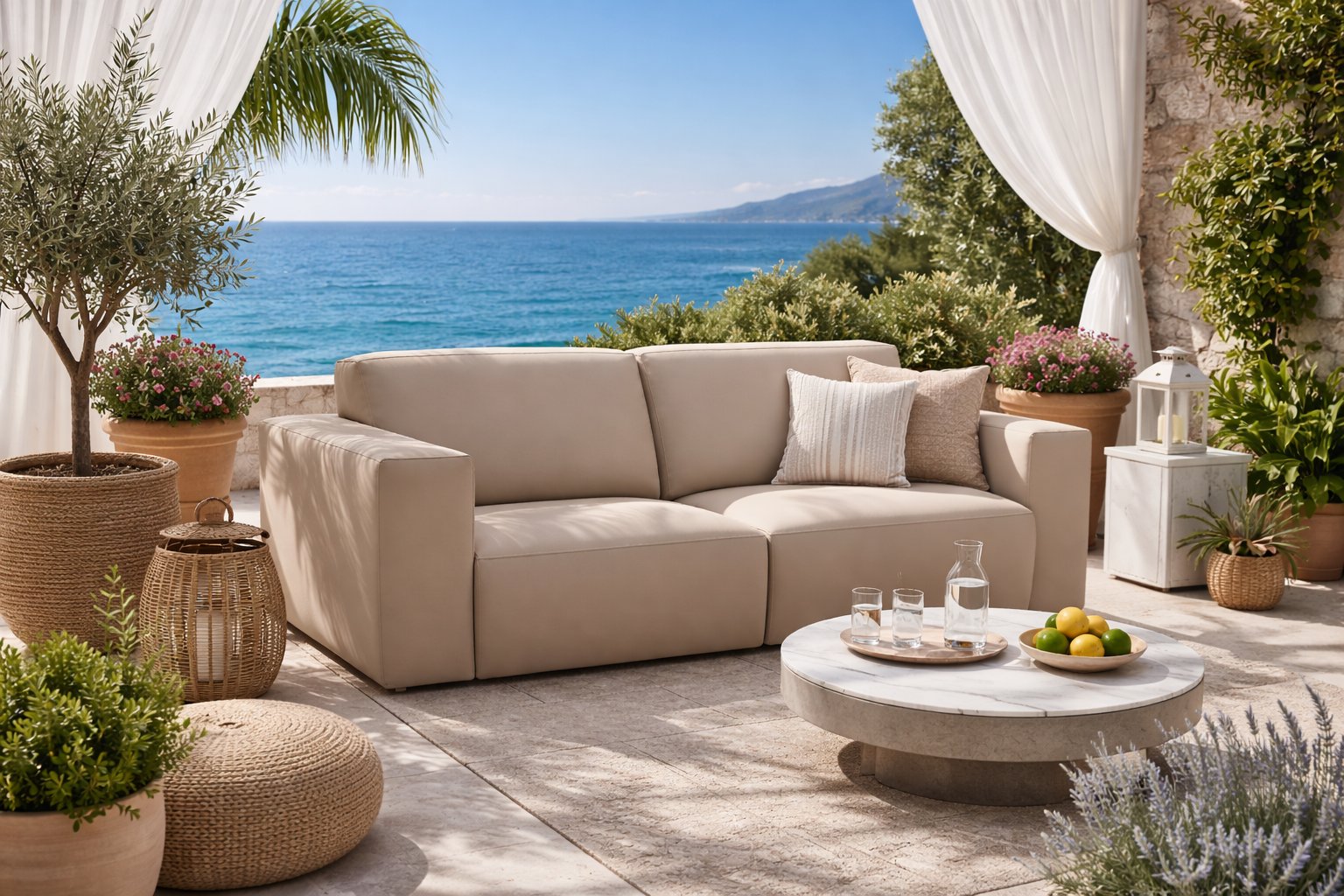 Canapé d’extérieur tissu imperméable, anti UV, anti Gel et composable